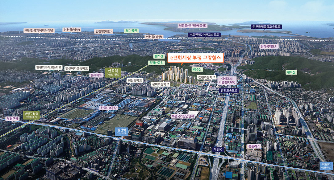 청천2구역 주택재개발 사업으로 진행되는 e편한세상 부평 그랑힐스는 총 5,050세대 31개동의 미니신도시급 규모로 조성되며 인근에는 지하철 7호선 연장선인 산곡역과 석남역이 개통될 예정으로, 산곡역을 통해서는 서울 서북생활권으로 빠르게 이동이 가능해지며 석남역은 향후 청라국제도시역까지 노선이 연결될 예정이다.