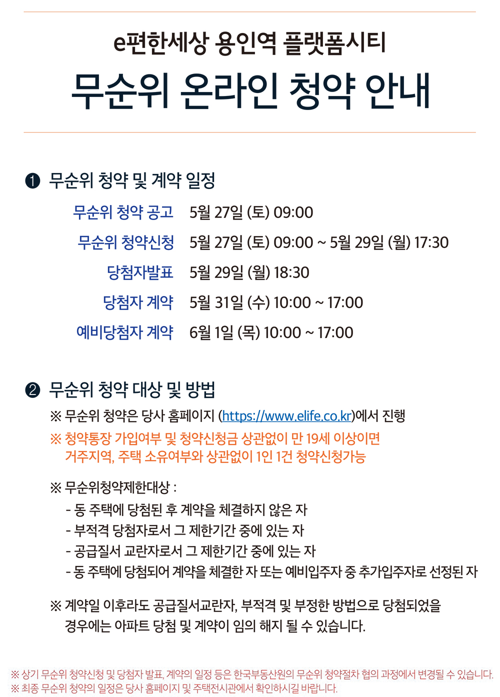 ◆ 이편한세상 용인역 플랫폼시티의 무순위(사후) 입주자모집공고일은 2023년 5월 27일(청약자 나이 등 청약자격조건 판단기준일.)이며, 무순위(사후) 입주자모집공고일 현재 국내에 거주하는 성년자 [만19세 이상인 자 또는 세대주인 미성년자(자녀양육, 형제자매부양)]에게 공급한다.