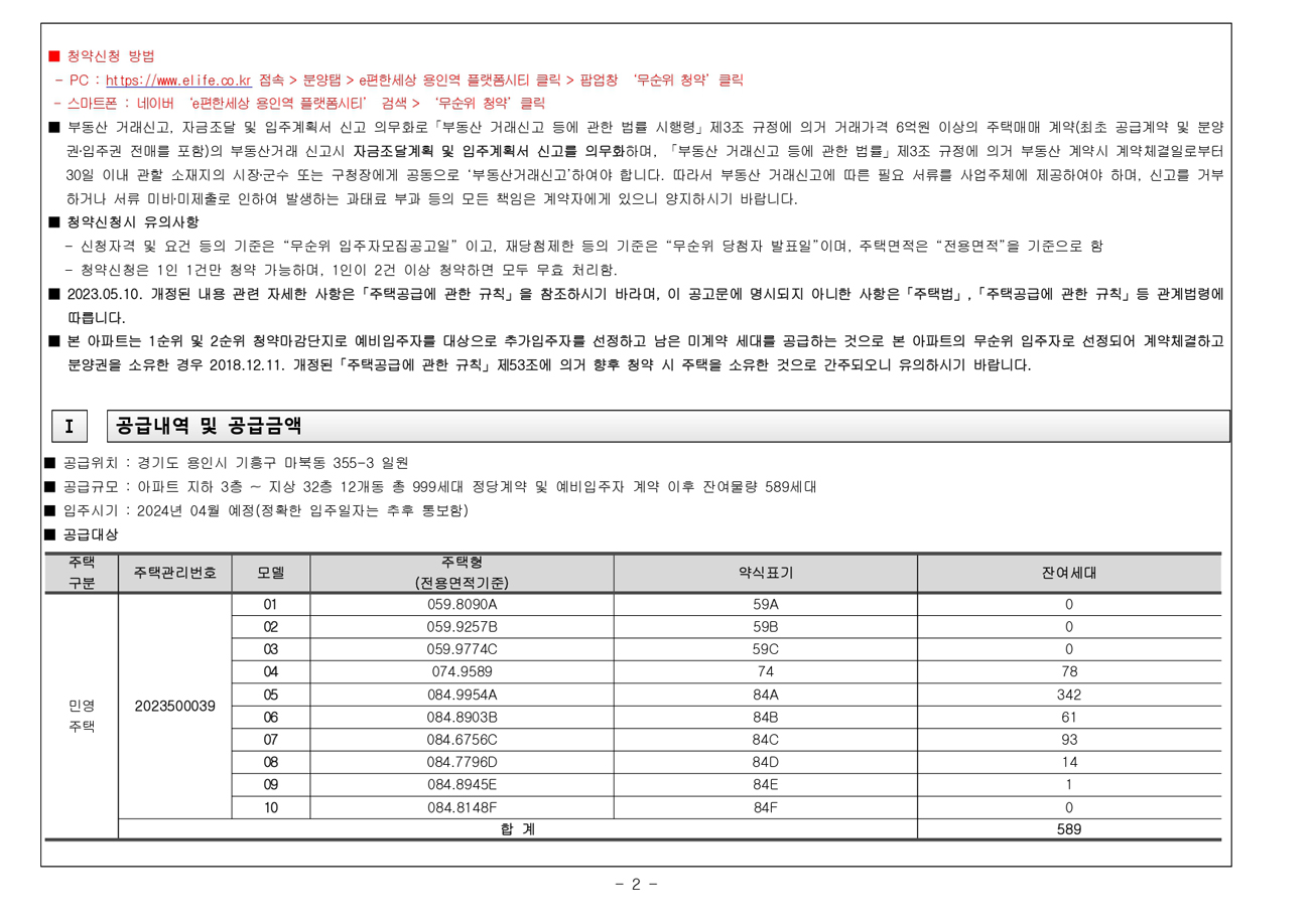 e편한세상 용인역 플랫폼시티 무순위청약 : 용인 플랫폼시티 이편한세상 줍줍 무순위 사후 청약신청은 5월 27일부터 29일까지, 당첨자발표는 5월 29일이며, 지하 3층 지상 32층 12개동 총 999세대 중에서 정당계약 및 예비입주자 계약 이후의 잔여물량 589세대 전용면적 74㎡~84㎡ 총 6개타입이 공급대상이다.