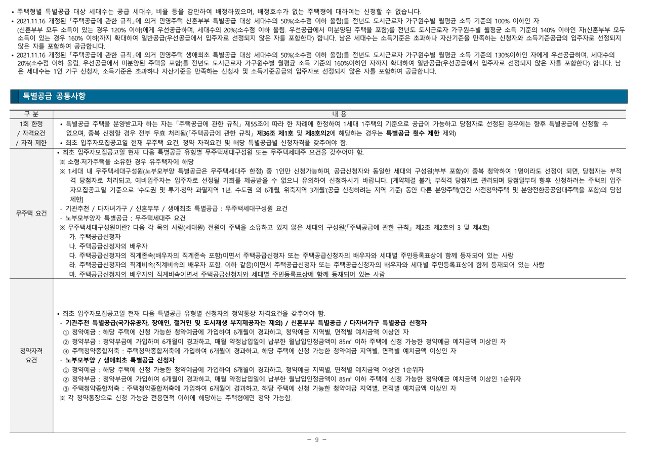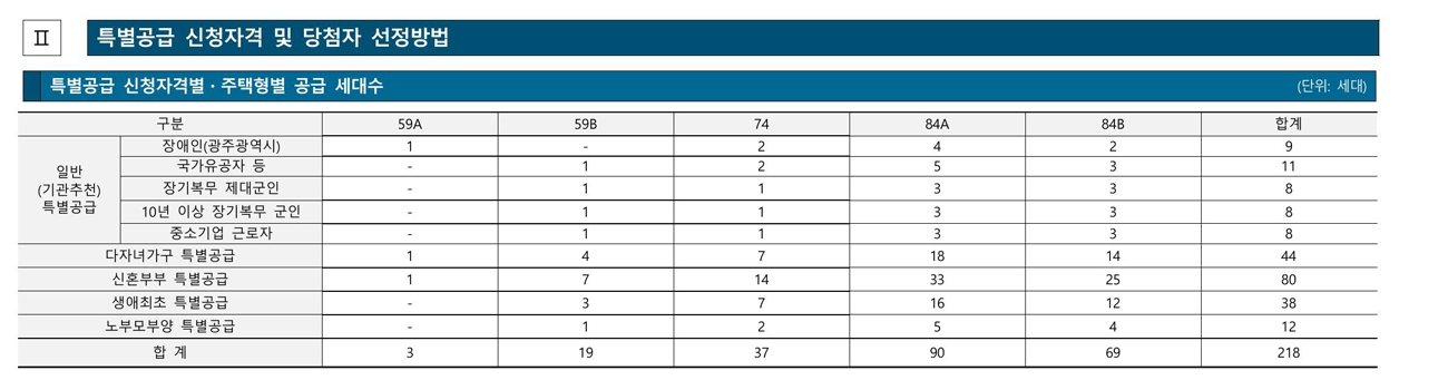[특별공급 218세대 : 일반(기관추천) 44세대, 다자녀가구 44세대, 신혼부부 80세대, 노부모부양 12세대, 생애최초 38세대 포함 / 일반공급 243세대] [조합원 276세대 배정, 임대 70세대, 보류지 8세대]