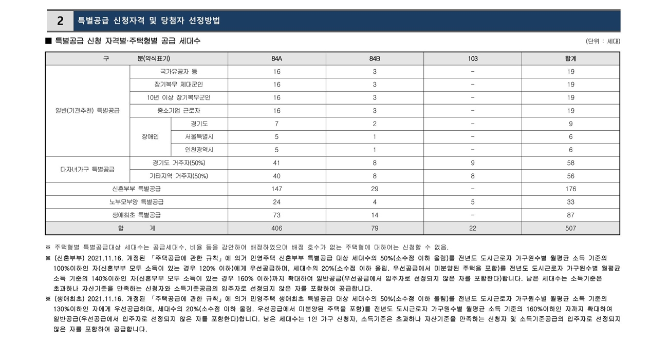 [특별공급 507세대 (기관추천특별공급 97세대, 다자녀가구특별공급 114세대, 신혼부부특별공급 176세대, 노부모부양특별공급 33세대, 생애최초특별공급 87세대) 포함]