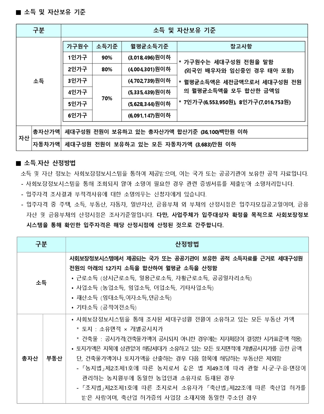 입주자모집공고일(2023.06.05) 현재 무주택세대구성원으로서 아래의 ‘소득 및 자산보유 기준’을 충족하는 사람(단, 모집공고일로부터 입주 시까지 무주택세대구성원을 유지해야 하며, 무주택세대구성원을 유지하지 않을 경우 당첨취소 및 계약거절 등의 불이익을 받을 수 있으니 이점 유의하시기 바라며, 신청자의 세대구성원 중에 과거에 공공임대주택 임차인으로서 불법양도·전대 행위로 적발된 후 4년이 경과되지 않은 자가 있는 경우 신청자는 공공임대주택 입주자로 선정 불가함.)