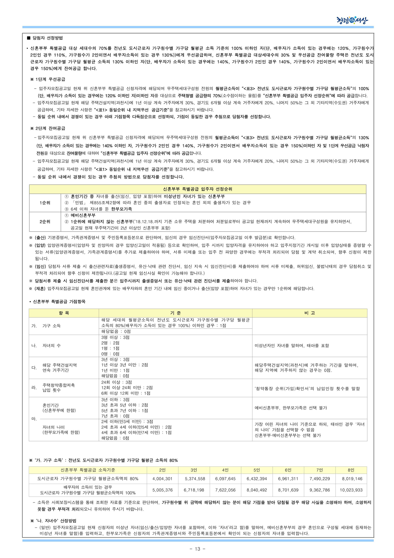 | 유의사항 | - 입주자는 입주자모집공고일부터 입주 이후 분양전환 당시까지 무주택세대구성원 요건을 유지하여야 하며, 임차권을 양도하거나 임대주택을 전대할 수 없음 (단,「공공주택 특별법」에서 규정하고 있는 근무, 생업, 질병치료 등 예외사항 발생 시에는 LH의 동의를 받은 경우 양도나 전대가 가능) - 임대차계약은 2년마다 갱신하며, 계약 갱신 시 임대보증금과 월임대료는「주택임대차보호법」에서 정한 범위 내에서 주거비 물가지수 등을 고려하여 증액될 수 있음 |