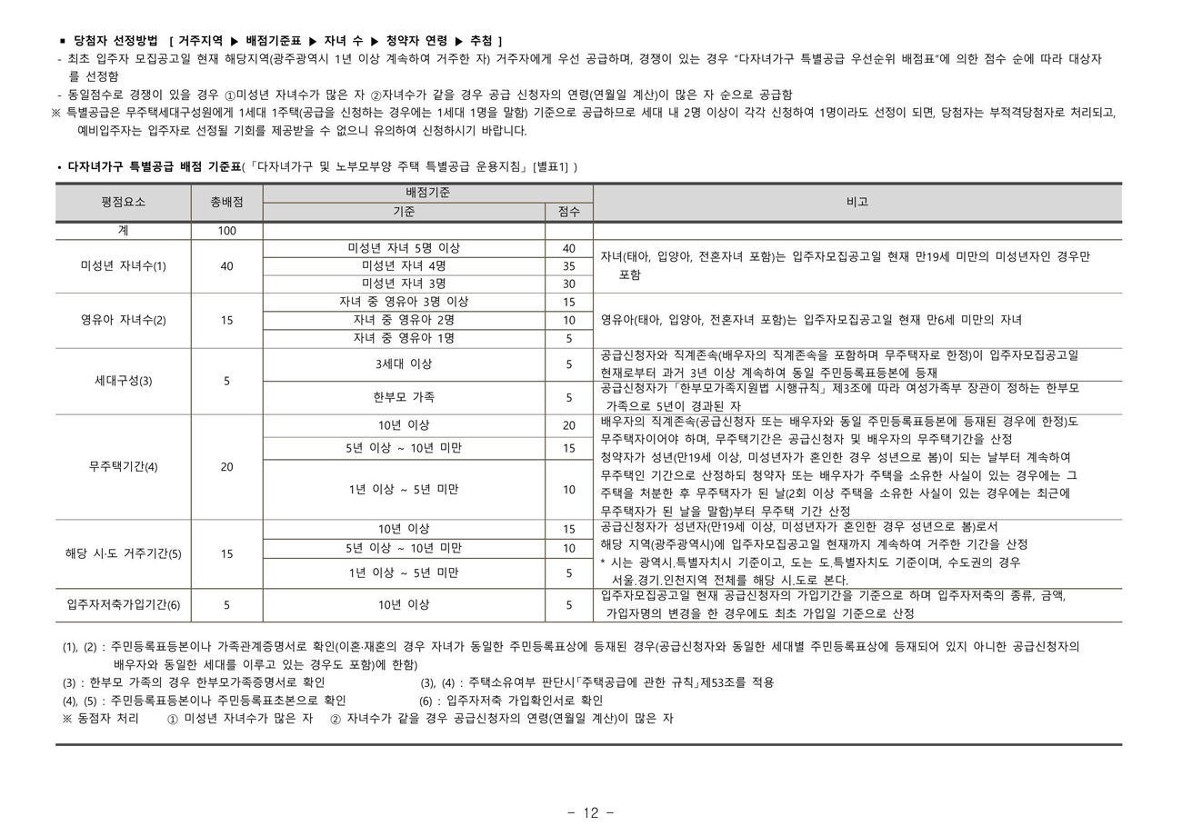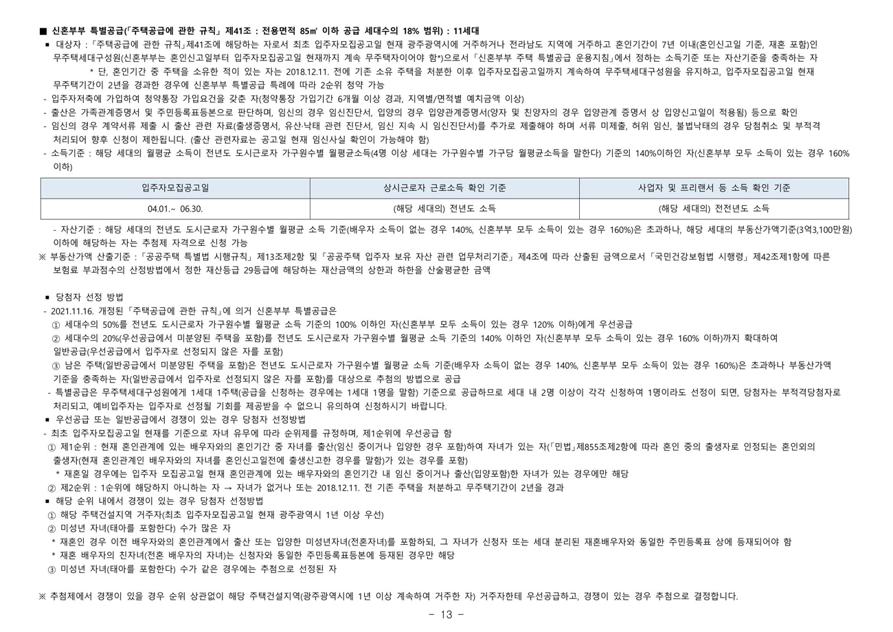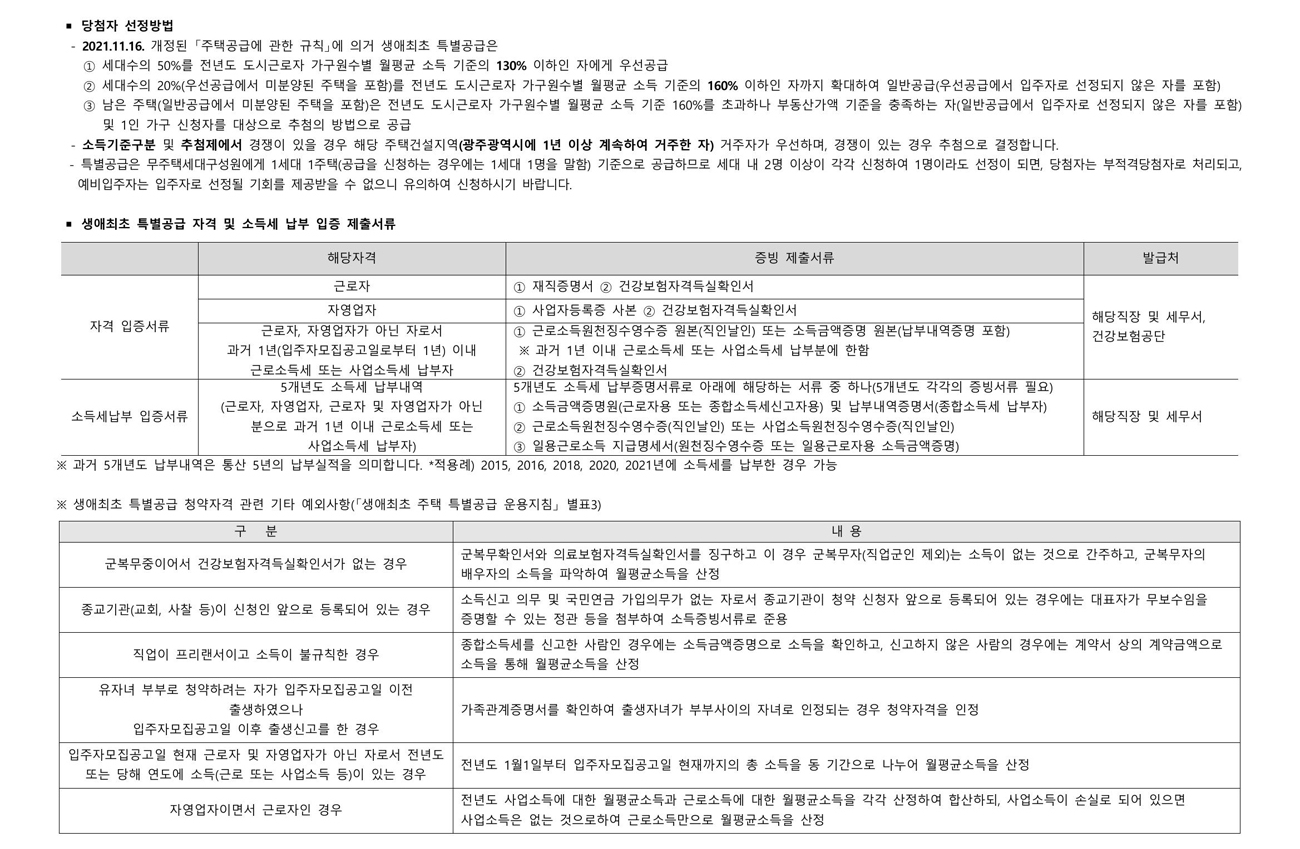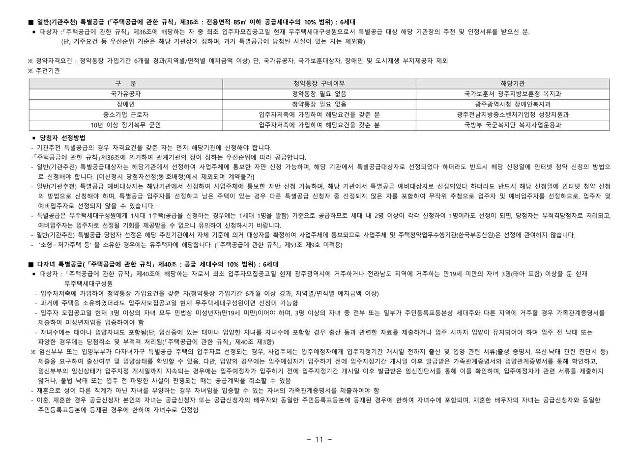 다만 청약 신청자 중 동일 자격 또는 같은 순위 내에 경쟁이 있을 경우 해당 주택건설지역인 광주광역시 1년 이상 계속 거주(2022.06.09 이전부터 계속 거주)한 신청자가 광주광역시 1년 미만 및 전라남도 거주 신청자보다 우선하며, 광주광역시 1년 미만 거주자 및 전라남도 거주자로 신청하신 분은 입주자 선정에서 제외될 수 있다.
