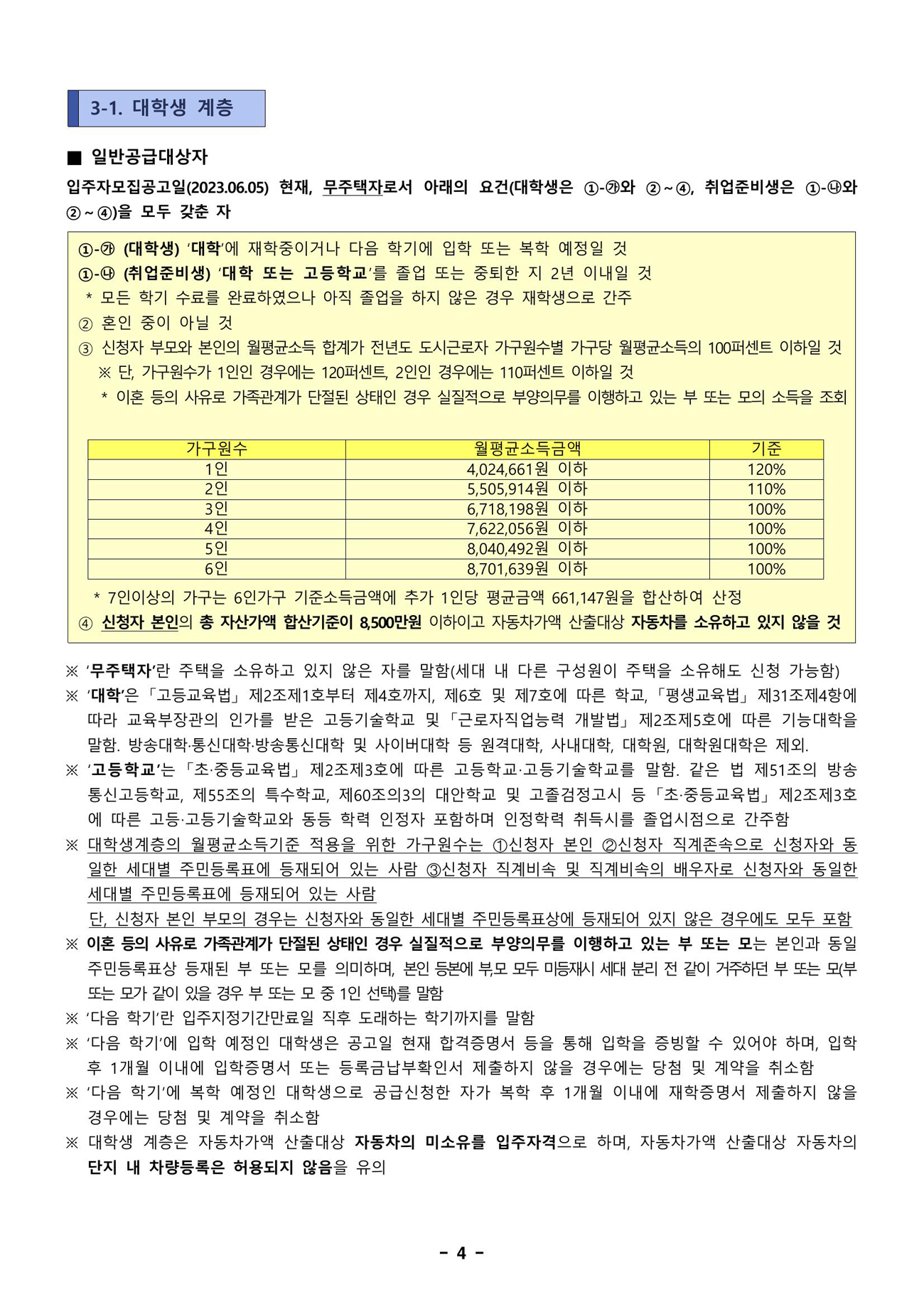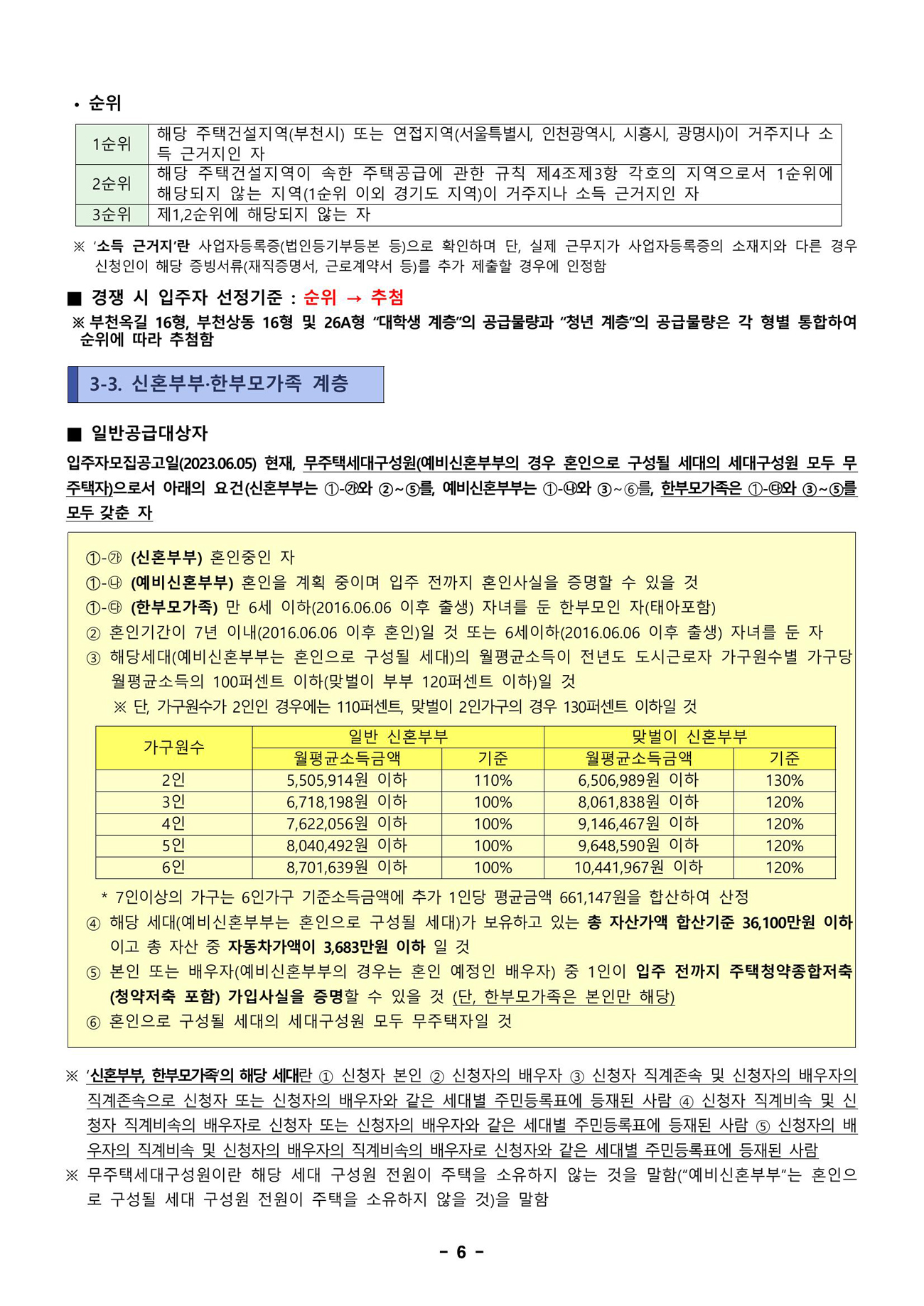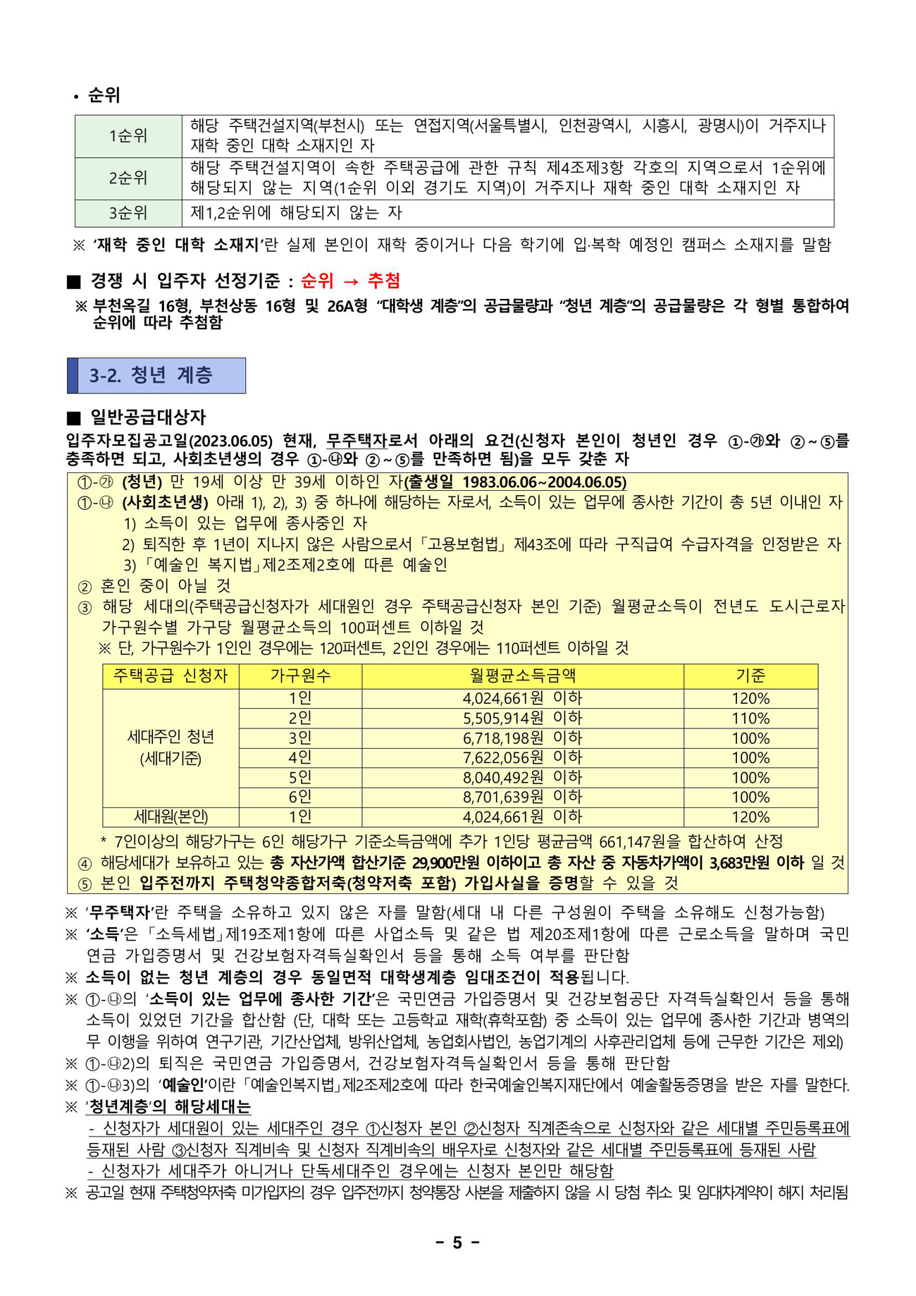 ◆ 금회 공급하는 부천옥길 행복주택, 부천상동 행복주택은 입주자모집공고일인 2023년 6월 5일 현재 다음 중 하나에 해당하는 사람에게 공급된다. ※ 신청자격별 세부 자격요건은 공고문 본문(3. 신청자격)을 확인하시기 바람.