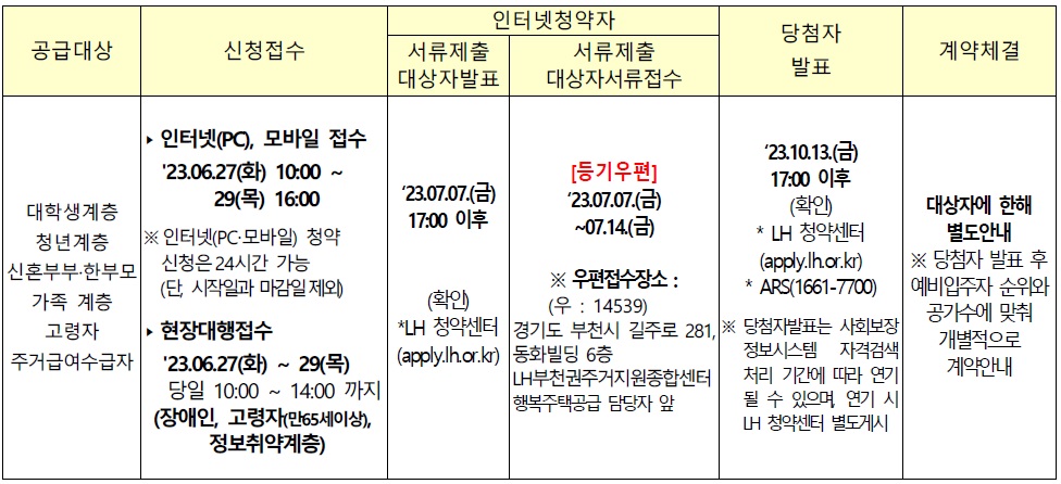 부천 행복주택 / 부천옥길 행복주택 / 부천상동 행복주택 : 부천시 행복주택 예비입주자 모집 청약신청은 6월 27일부터 29일까지 3일동안 진행되며 서류제출 대상자발표는 7월 7일, 당첨자발표는 10월 13일이다.