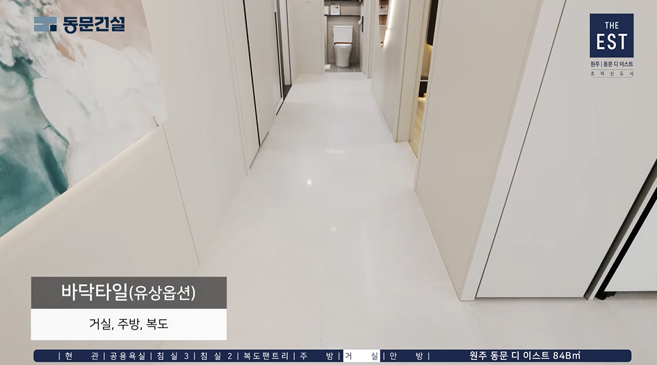 ※ 타일바닥 옵션시공은 거실+주방+복도이며, 옵션 미선택시 거실+주방+복도 바닥은 침실과 동일한 강마루가 설치됨.