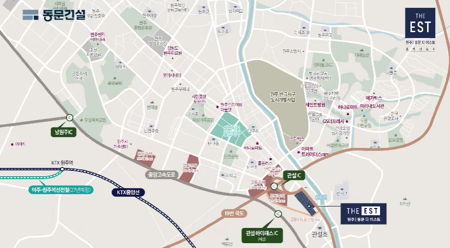 원주 동문 디이스트 강원도 원주시 관설동에 위치하는 원주 동문디이스트는 지하 2층 ~ 지상 15층, 11개동 총 873세대 전용면적 80㎡~115㎡ 총 5개평면으로 구성되어 있다. 원주 동문 디이스트 분양